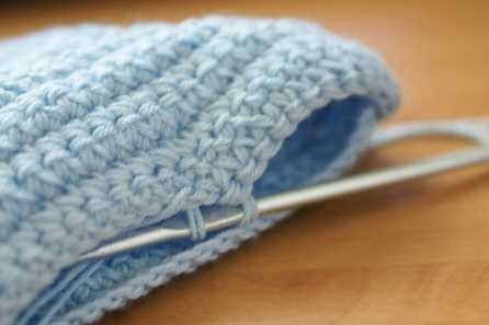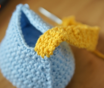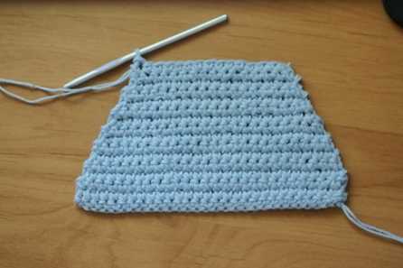 Вам потребуется: 50-60 гр. голубой пряжи, остатки пряжи желтого, зеленого, красного, розового, оранжевого, темно-синего. Крючок № 5, № 3, № 2,5.