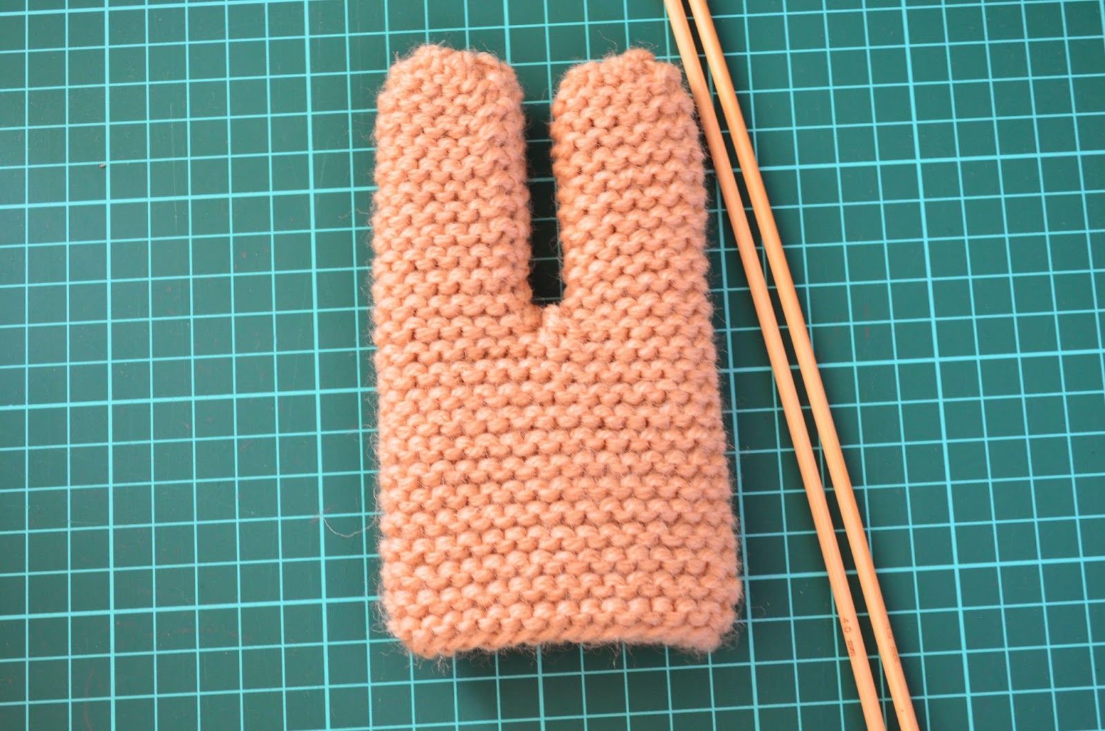 Далее вяжем ушки) Первые 2 петли провязываем вместе, дальше вяжем 14 петель (одно ухо) платочной вязкой (ушки двойной ниткой получились толстовато и остальным зайкам я вязала одиночной ниткой). Связав 7 см. закрываем все петли сразу, воспользовавшись крючком, закрепляем.