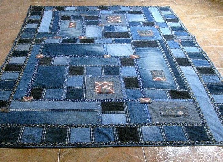 Пледы, одеяла и подушки, покрывала из старых джинсов обычно изготавливают в одной техник: